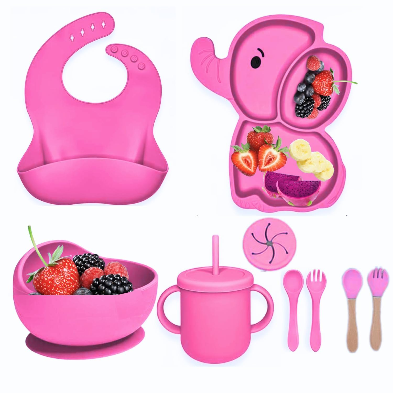 Complete 9-Piece Feeding Set: Includes a suction plate, bowl, spoon, fork, sippy/snack cup, and a bib, covering all your baby’s feeding needs.